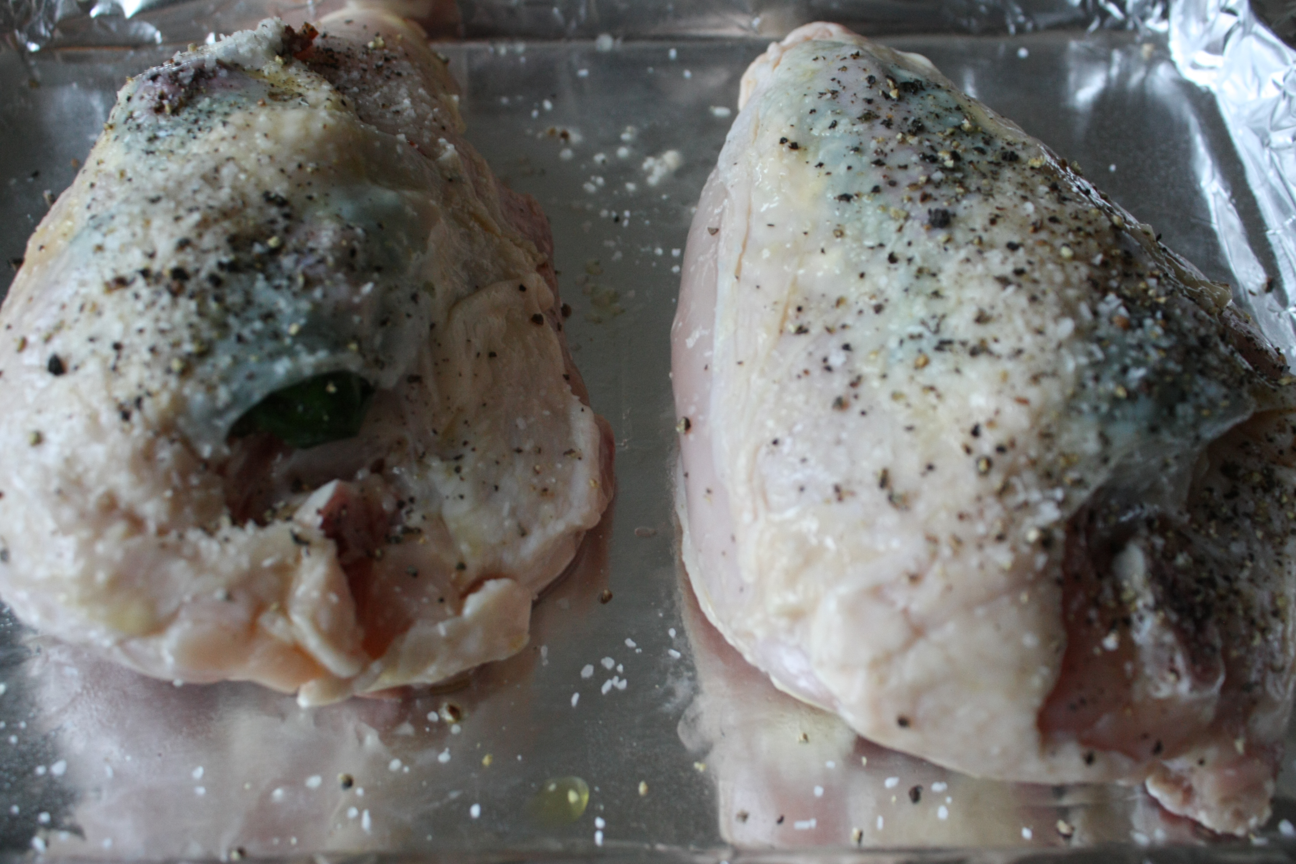 There’s nothing to chop, so prep only took about 5 – 10 minutes. All you need to do is slide the goat cheese, basil, and sun-dried tomatoes (if using) under the chicken skin. The order doesn’t matter too much, but we’ve found that adding the cheese first helps hold the other ingredients in place. When you’re done rubbing with olive oil and salting and peppering, it should look something like this (the lighter spots under the skin are the goat cheese, while the darker ones are the sun-dried tomatoes and basil):