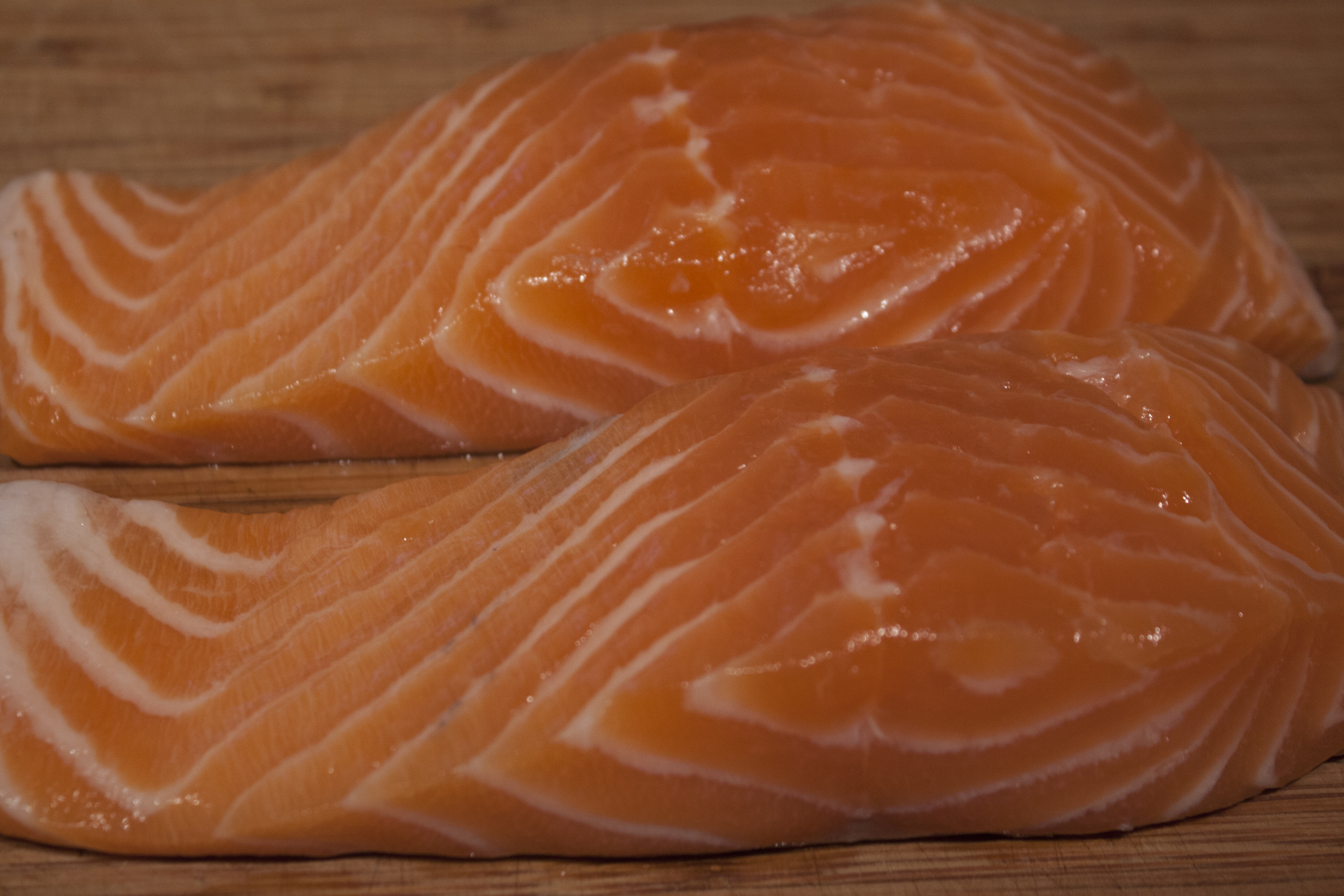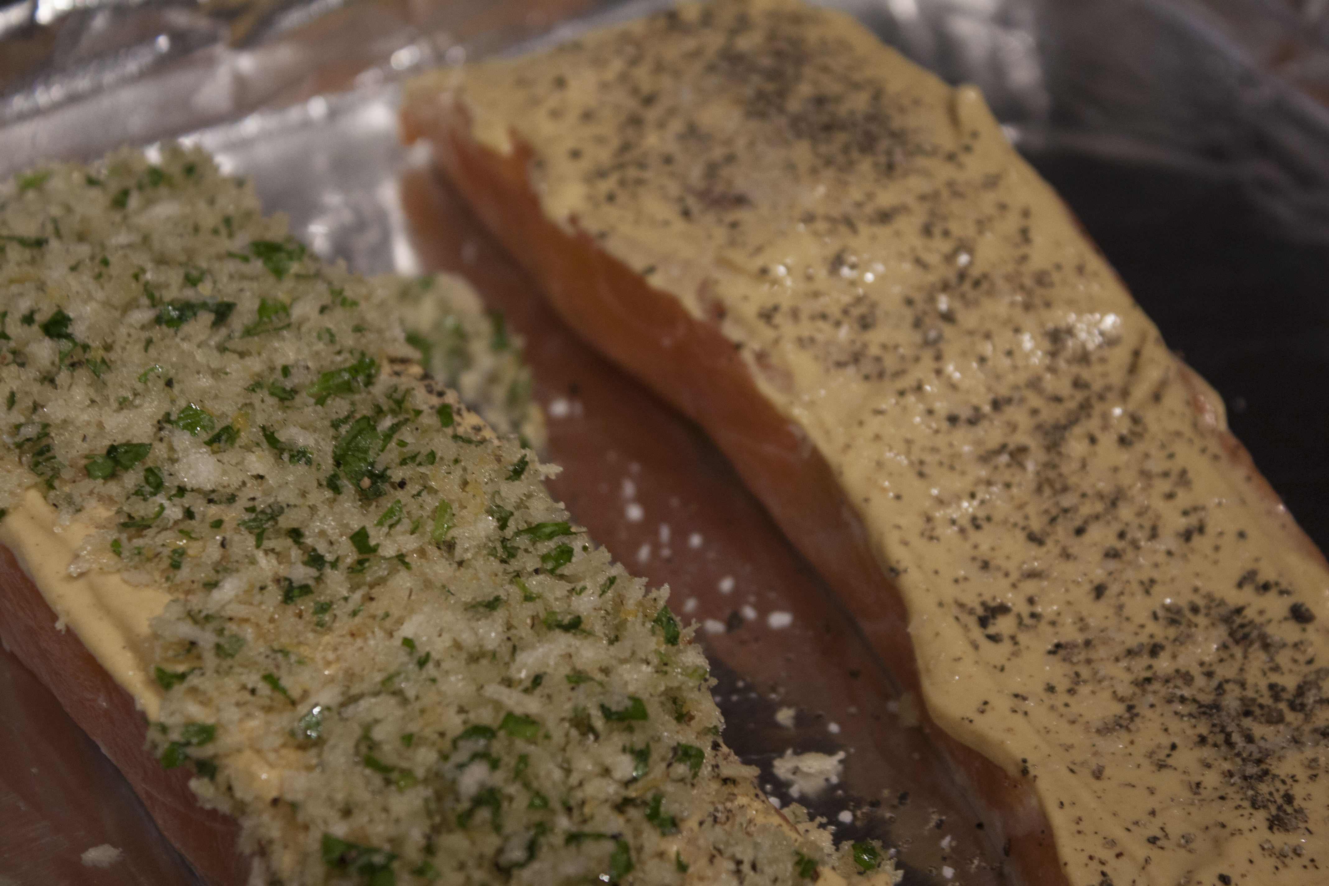 Next, I spread the mustard on the salmon. I tend to get a little carried away with this step, so there are always one or two bites during the meal that really wake me up! After adding the mustard, I sprinkled the salmon with salt and pepper, and then added the topping. You should spread it evenly, but don’t press down too hard; you want everything to hold together but not be squashed. The picture below gives you a before and after view (or technically, an after and before view) of this last step: