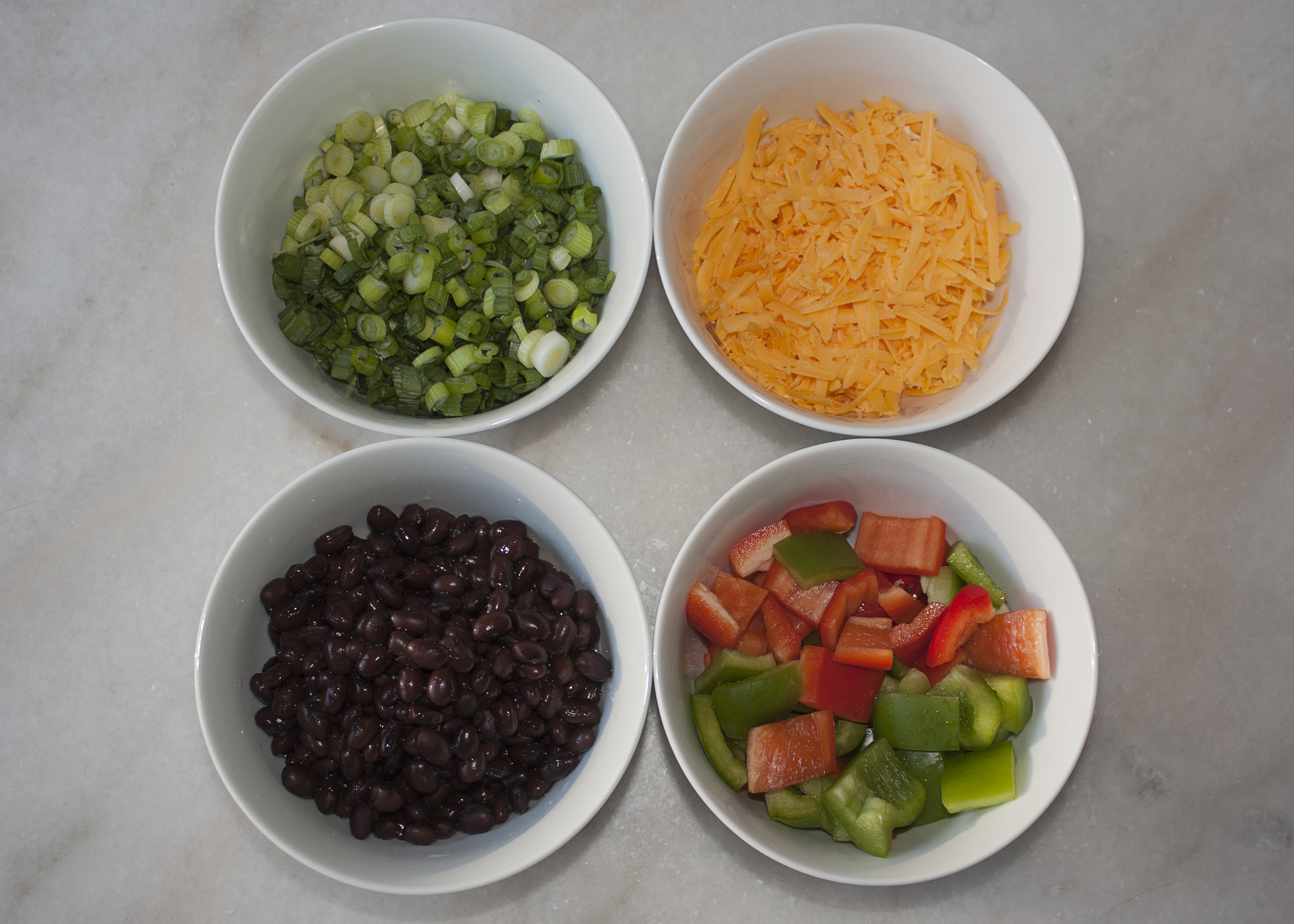 There isn’t a lot of prep involved, as you only need to grate 1/4 pound of cheddar, cut two bell peppers into 3/4 inch pieces, and slice up six scallions. This only took me about 10 or 15 minutes. (I decided that since the tomatoes get added at the very end, I would chop those while everything else was cooking.) I put everything into the fridge and waited for Kim to get home before starting to cook.