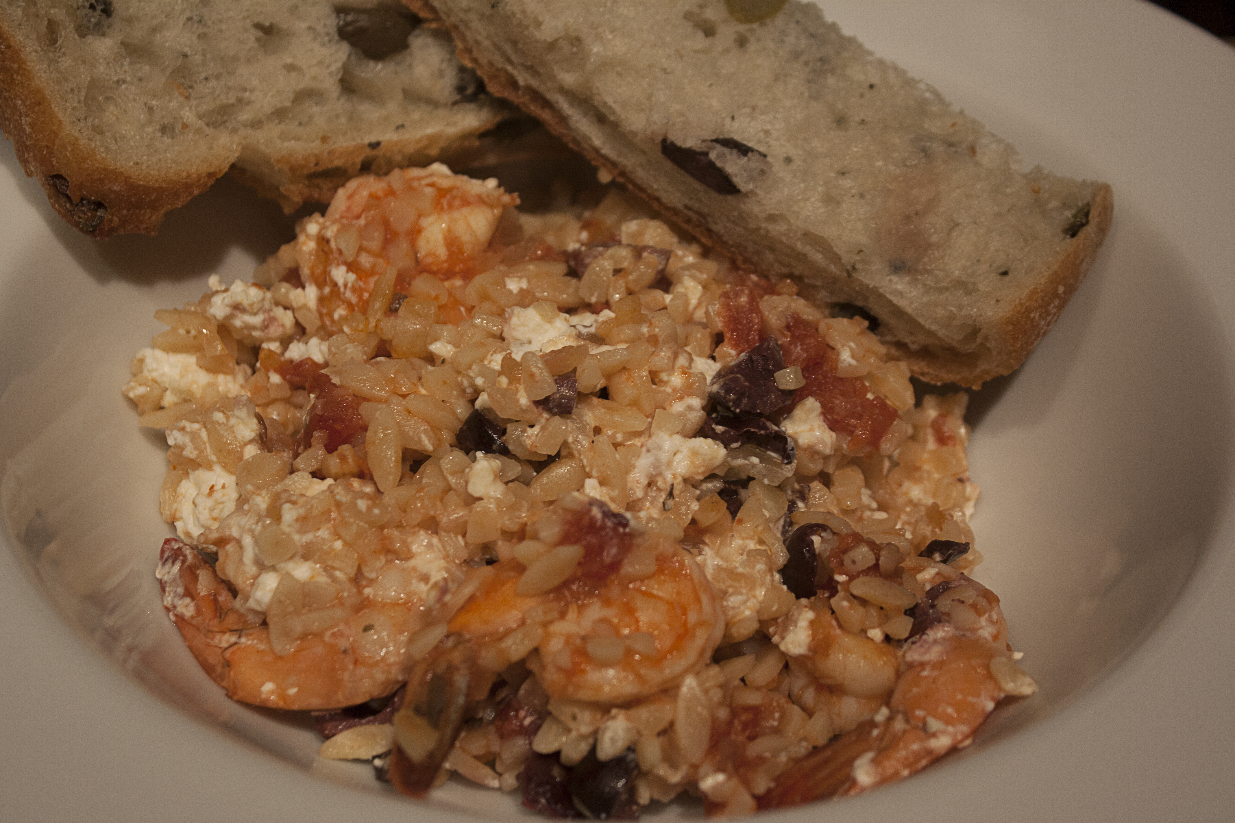 We have another baked orzo and shrimp recipe (two actually) that we like to make and while this one was good, it wasn’t as good as either of those other two, one of which uses lots of dill and the other of which uses fennel. We ended up sprinkling some dill on this dish after we plated it, because it needed a little more flavor and a little more color. We decided we would make the dill version of this recipe next time, but would try adding the Kalamata olives, just to see what happens!
