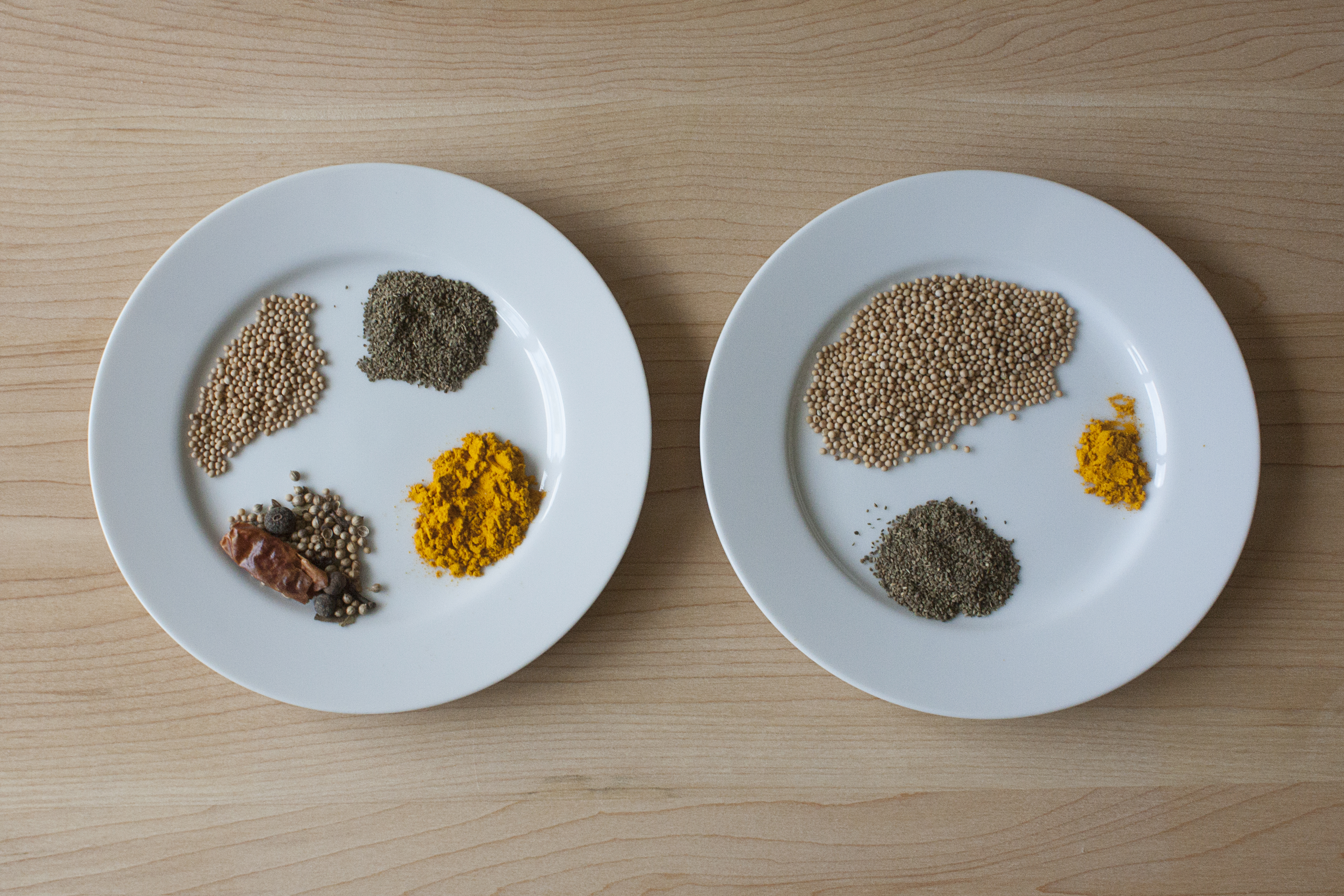 The spice mixes for the two kinds of pickles are similar, but not identical, either in type or in quality, as the picture below shows. Alton’s recipe, which is the left plate, uses equal amounts of (clockwise from top left) mustard seed, celery seed, turmeric, and pickling spice, while Lori’s uses (clockwise from top left) much more mustard seed, much less turmeric, the same amount of celery seed, and no pickling spice. I’ve already mentioned that the two recipes use different kinds of sugar, but they also use different kinds of liquid: water and cider vinegar for Alton’s recipe and white vinegar and cider vinegar for Lori’s.