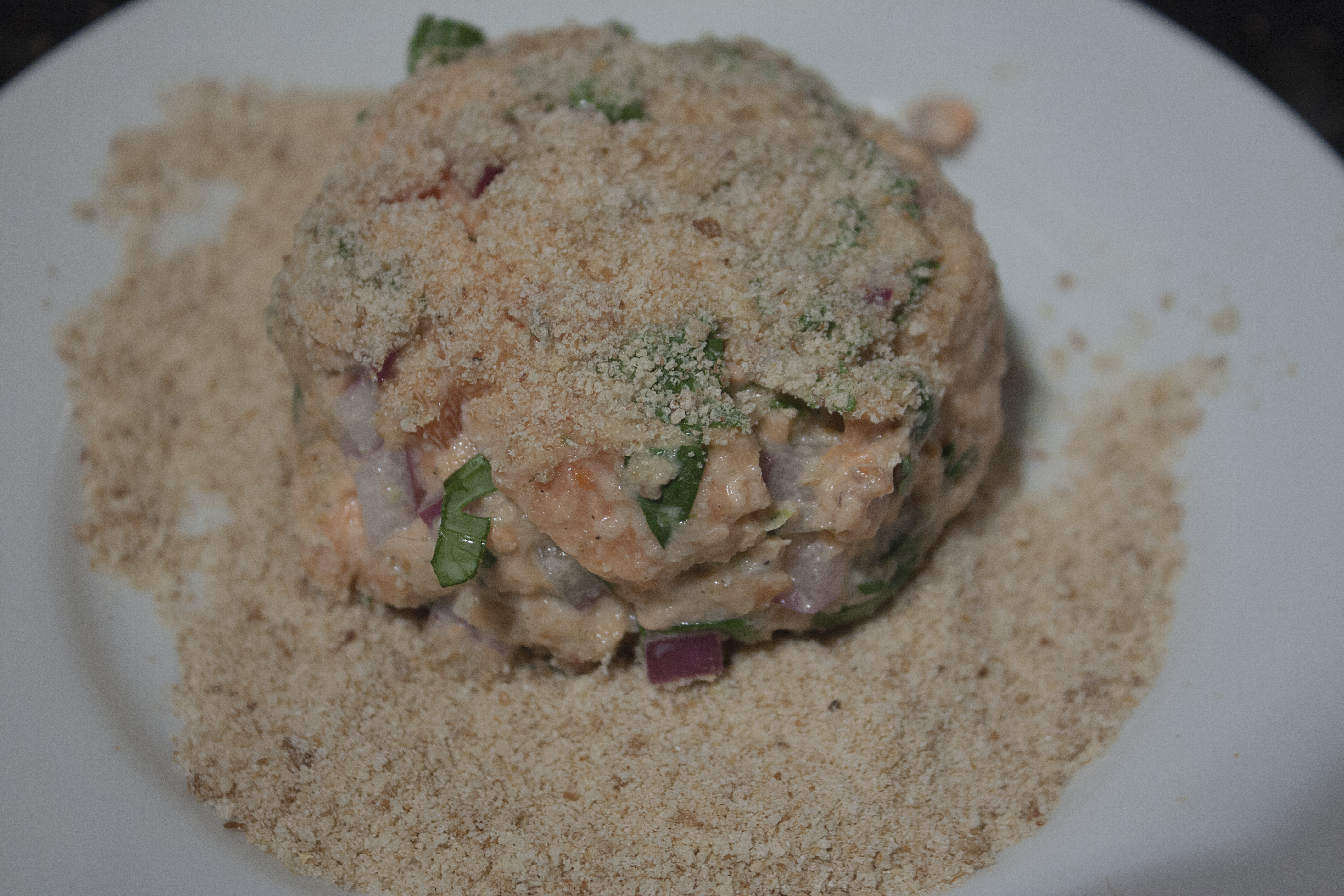 Mixing the ingredients for the salmon cakes was exactly how the recipe described—it was very easy to get it to a “moist tuna salad” consistency.