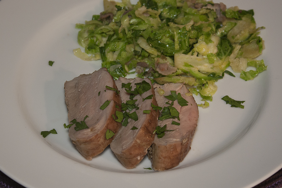 As I finished the Brussels sprouts the pork was ready to come out of the oven. It was perfect cooked after about 25 minutes. I let the pork rest for about 10 minutes before slicing. The meat was juicy and delicious with the fig balsamic glaze adding just enough sweetness to balance out the slightly bitter with the Brussels. The brussels sprouts were also excellent, with anise hint of saltiness from the pancetta. (I think Tony went back for thirds!) We paired this dinner with a dry Riesling, which was a perfect match for the pork. This was a simple and elegant dinner that hardly made it feel like a Wednesday night.
