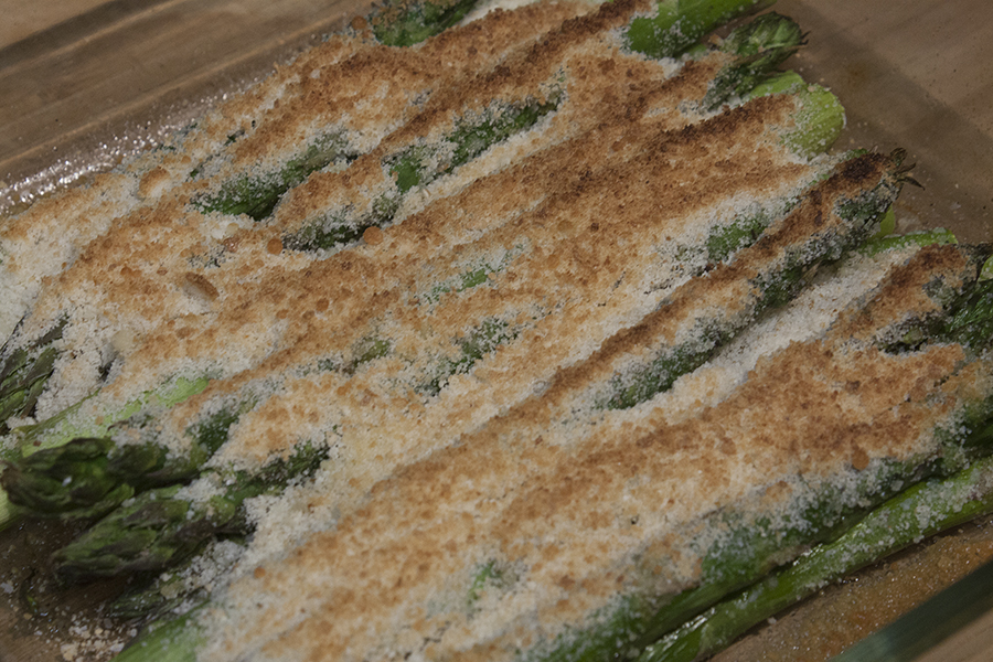 Thursday, we had a mix of one leftover, Garlic-Rosemary Rubbed Pork Loin, and a new side, Roasted Asparagus with Crunchy Parmesan Topping. Here’s how Tony got dinner on the table: