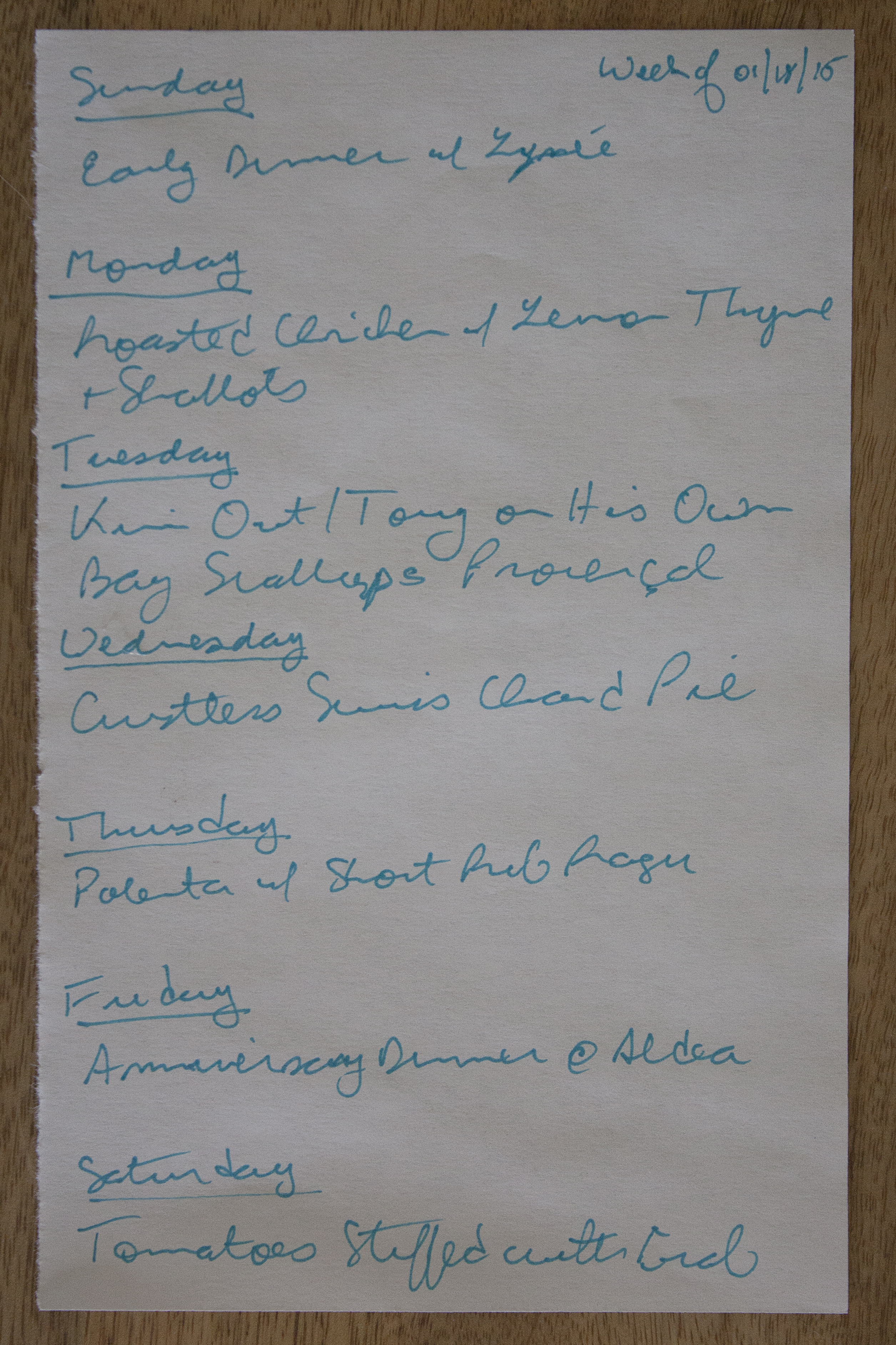 On Tuesday night, Kim has plans with her work colleagues, so Tony is going to make something he knows Kim wouldn’t be partial to: Bay Scallops Provencal, from a recipe he found in The New York Times. Bay scallops were highly rated on Fresh Direct this week, plus, last week was very meat-centric, so a little seafood sounded like a good idea.