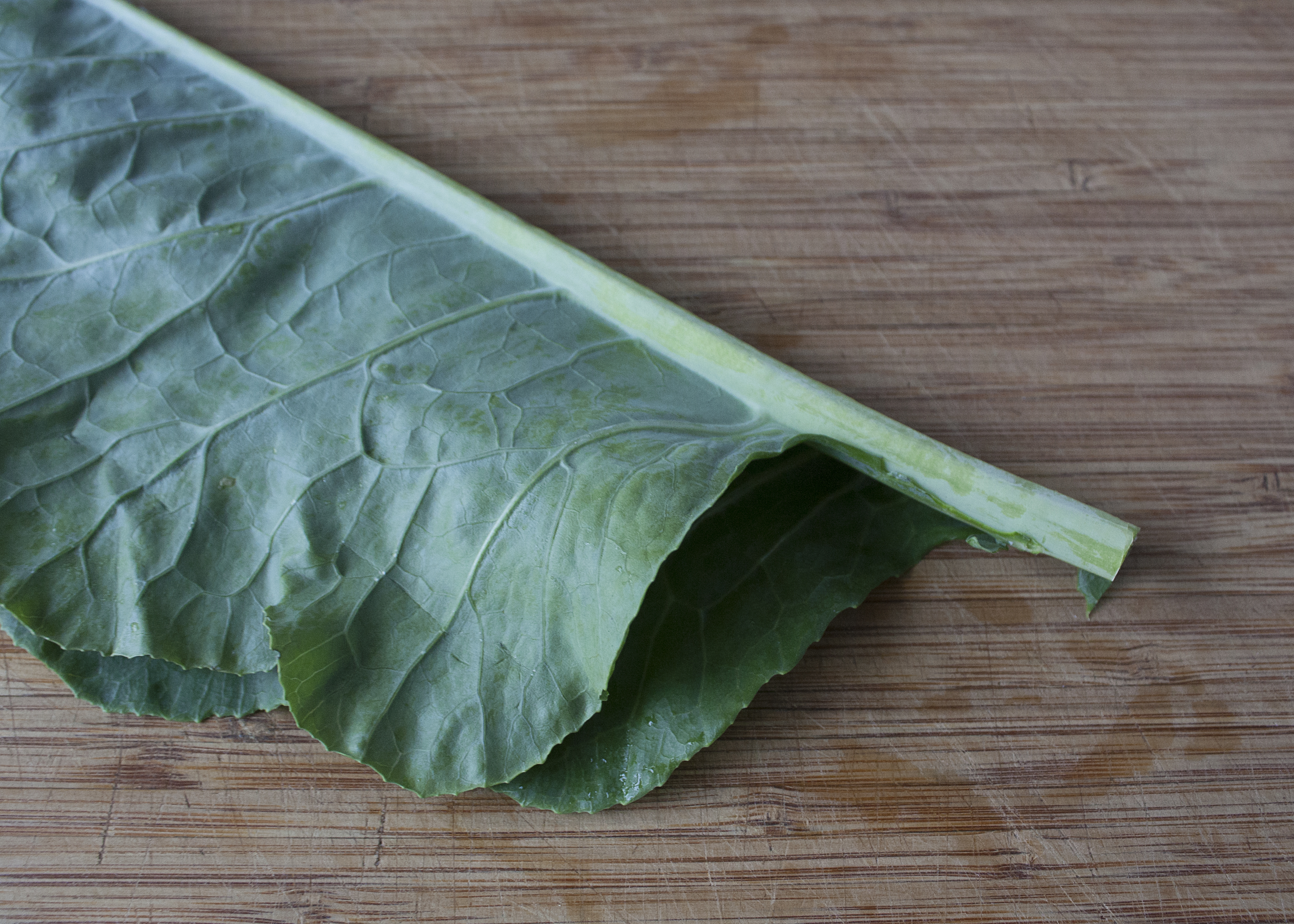 There was not a lot of prep involved with this recipe, which was nice. I removed the stems from the kale using the shortcut we use when we make Barbecued Chicken with Short-Cut Collard Greens. (The photos below are of collard greens, but you get the idea.)