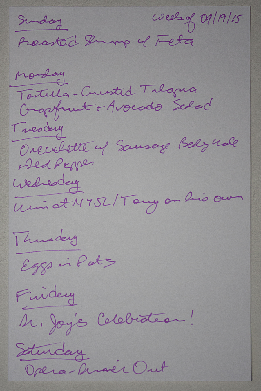 On Wednesday, Kim has a meeting at the Junior League. Tony was originally going to have (leftover) New York Times’ Roasted Chicken Provencal, which we made Saturday night and thoroughly enjoyed. Instead, he’s going to visit his mom and dad to help them work on the guest list for their 50th wedding anniversary party, which will be in October. He’ll have dinner with them, which means pasta two nights in a row. Having basically had pasta six nights a week from the time he could eat solid food to the day he left for college, Tony is completely unfazed by this…