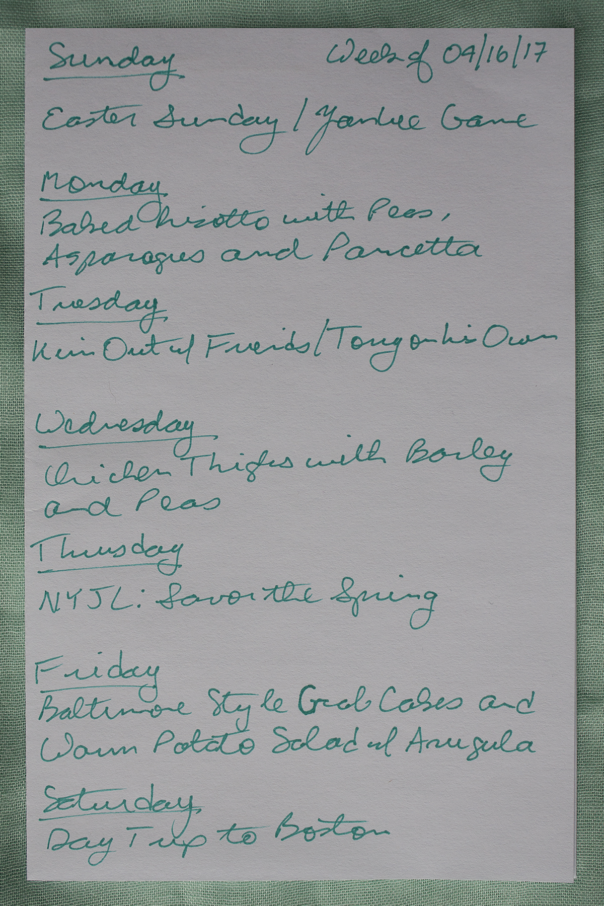 Tony will have drinks with his buddies Monday night, but will be home in time for dinner, so Kim will make The Kitchn’s Baked Risotto with Peas, Asparagus, and Pancetta. Kim has made some great risotto over the years, but this new recipes sounds perfect for spring. (Italian food segue: we went to Gennaro’s on Amsterdam Avenue Saturday night. Her quest to find the Upper West Side’s best Linguine and Clams was derailed by Gennaro’s always amazing specials menu, from which she ordered a spectacular seafood risotto, preceded by a fava bean and arugula salad. Tony had cuttlefish and ratatouille over polenta to start, followed by sausages with broccoli rabe.)