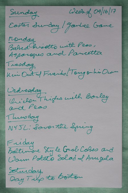 Sunday is Easter and we will be having lunch with Tony’s family. It will be simple but tasty: sandwiches made with salumi from the local Italian deli. We’ll head home after lunch and gear up for our first Yankee game of the season, against the Cardinals. (Tony has always had an odd fondness for the St. Louis Cardinals, as it is the only non-New York franchise his dad was familiar with, even if dad did call them “Santo Luigi”!) We haven’t decided what sort of snacks well have at the ballgame, but as Tony discovered the Blue Point beer stand on opening day, and since it is right next to the Parm stand, we might have dinner already picked out for us. Tough call though, as the revamped Yankee Stadium menu now features Mightly Quinn’s Barbecue and Bareburger.
