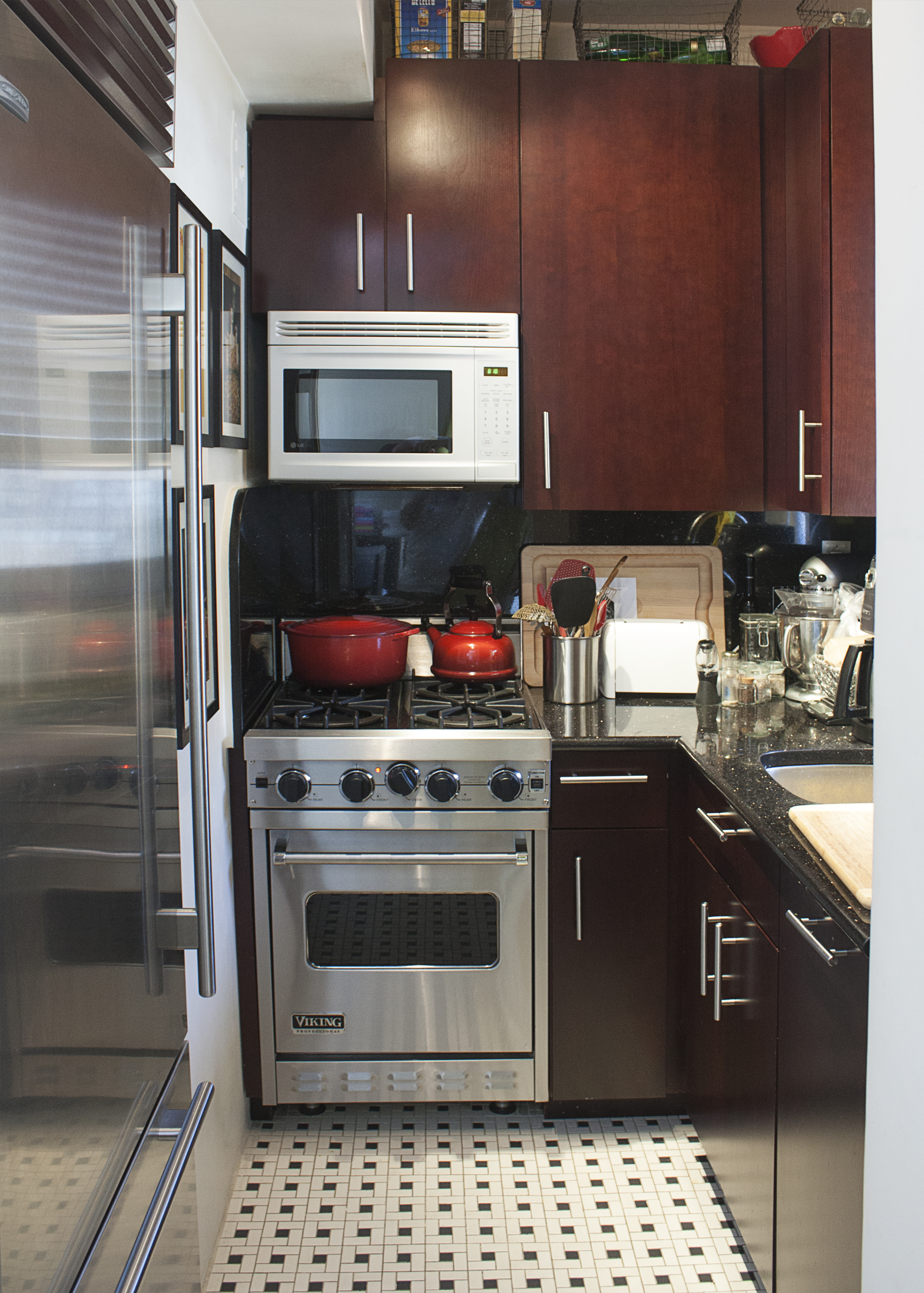 A: Tiny, as the picture above shows. If you measure wall to wall, it’s about 5 feet by 7 feet, or 35 square feet. If you just measure the tiled area (basically, where we can stand), it’s more like 3.5 feet by 5 feet, or 17.5 square feet. In other words, you don’t need a big kitchen to do what we do!